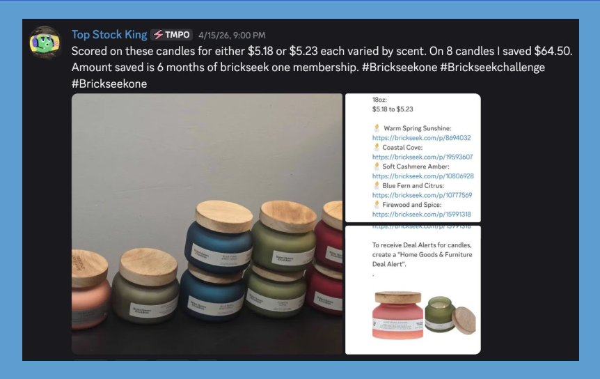 This member saved $64.50 on 8 candles, equivalent to 6 months of a BrickSeek One membership. BRICKSEEKERS LIKE US SAVE MONEY, JUST LIKE THIS!!!
