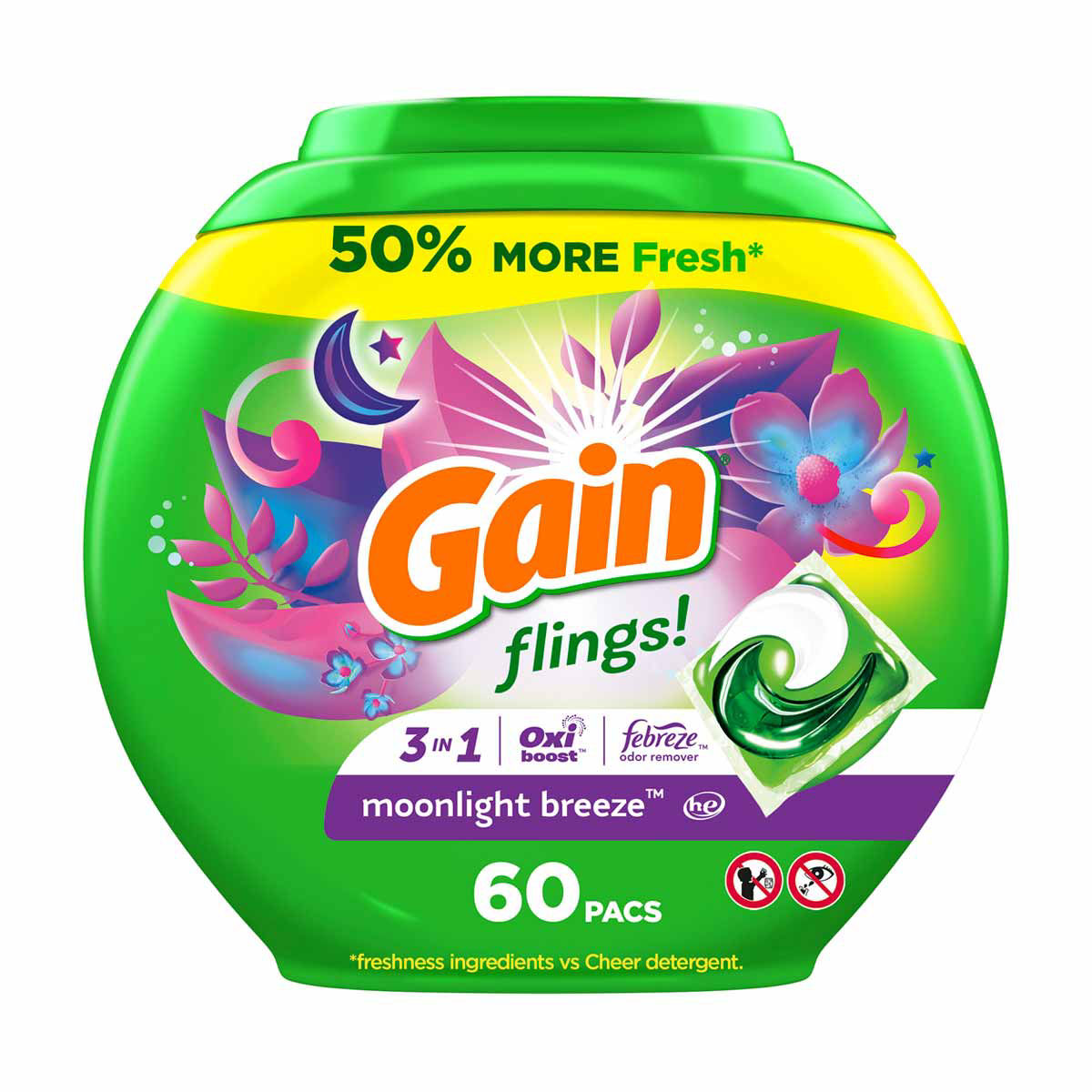 Gain Flings Liquid Washing Detergent pacs with Odor Defense + Color Guard, Moonlight Breeze Scent, 60 Count, 4-In-1 liquid laundry detergent pacs (Oxi, up to all day scent, Febreze Odor Defense and color guard), clean & fresh