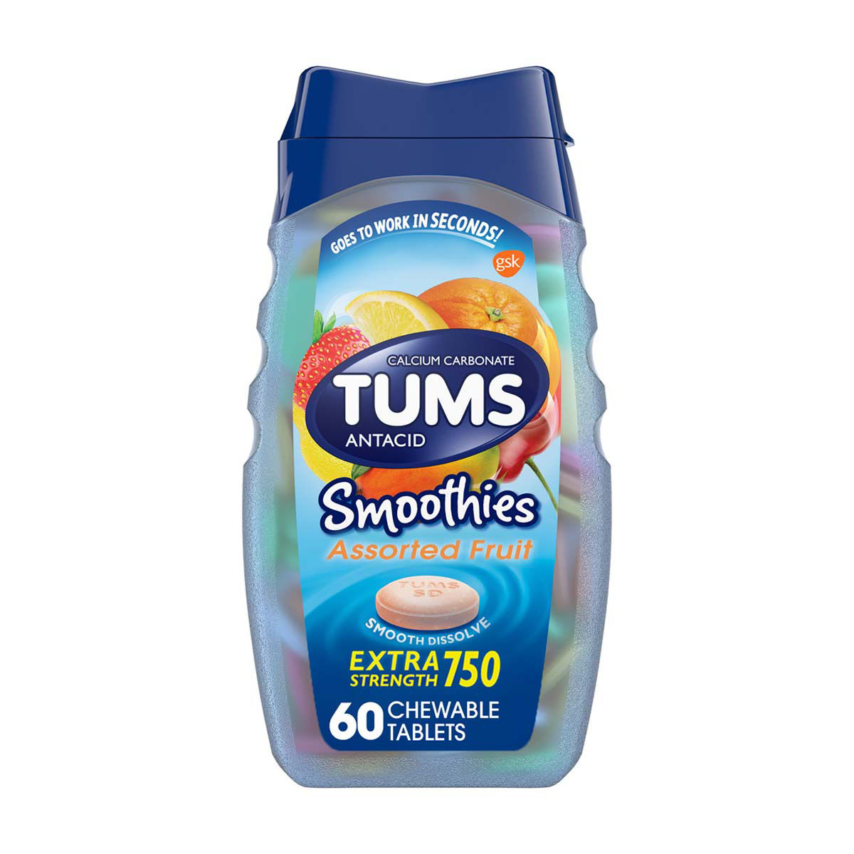 TUMS Smoothies Extra Strength Antacid Chewable Tablets, Assorted Fruit Flavor, 750 mg, 60 ct