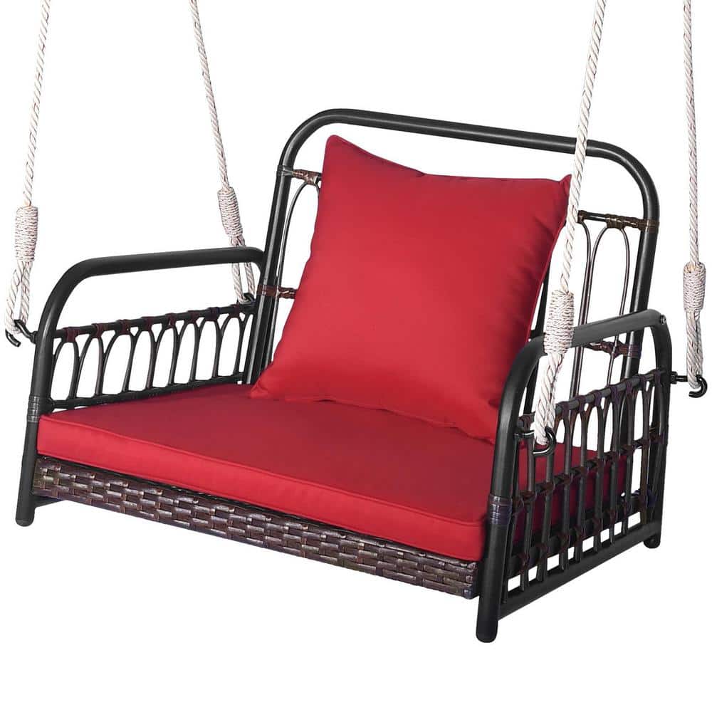 AFAIF Hanging Porch Swing, 1 Person Patio Wicker Swing Chair with Metal Frame, Cushion, Ropes and Hooks, for Lawn Garden, Red