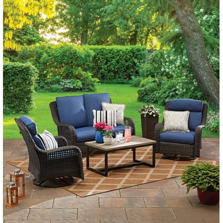 Better Homes & Gardens Ravenbrooke 4-Piece Outdoor Wicker Swivel Chair Conversation Set, Blue