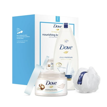 Dove 3-Pc Beauty Gift Set Macadamia & Deep Moisture with BONUS Pouf (Body Polish, Body Wash)