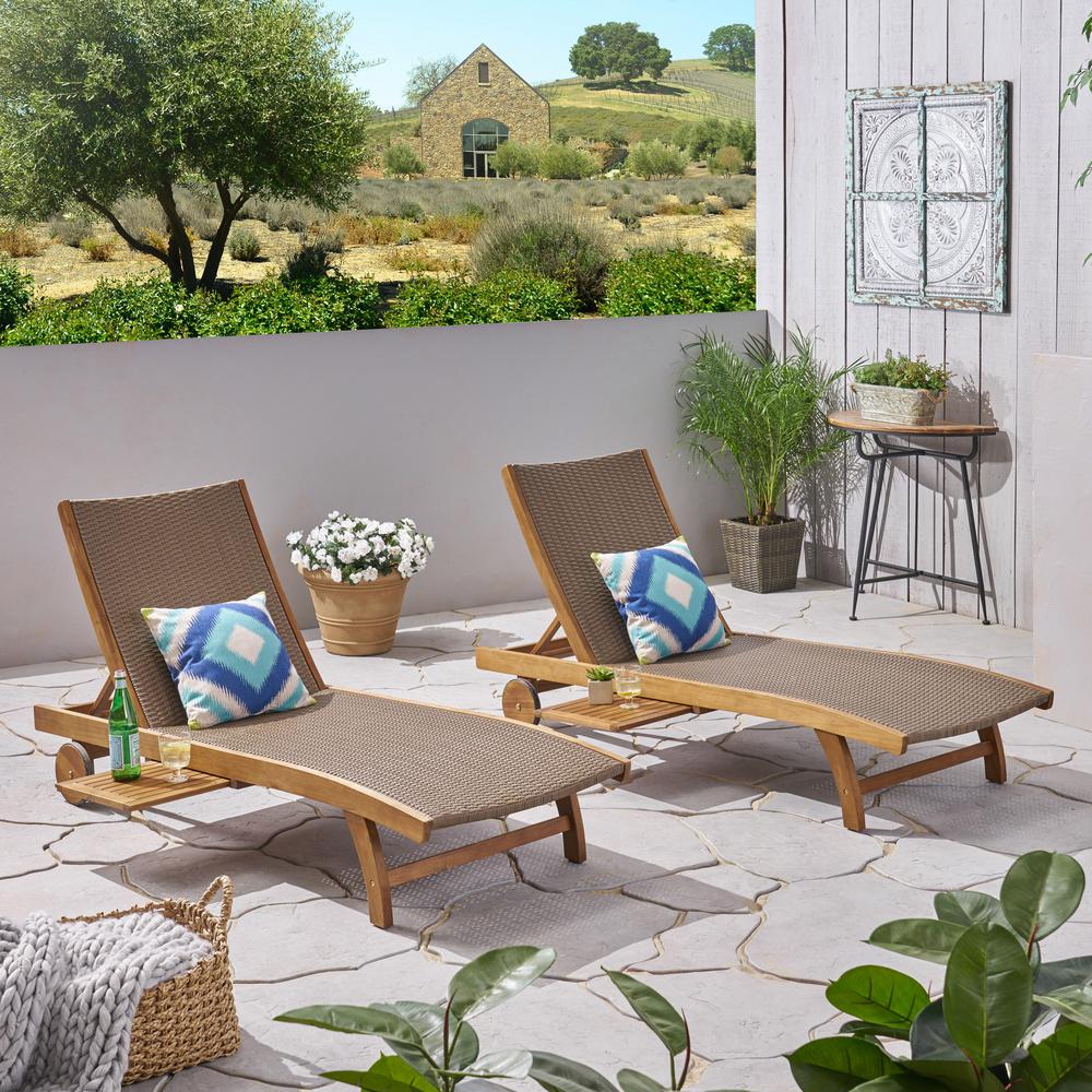 Emmanuel Outdoor Wicker and Wood Chaise Lounge with Pull-Out Tray, Set of 2, Brown, Teak