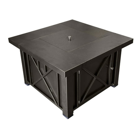 Hiland 38'' Square Propane Fire Pit Table w/Lid, Fireglass Included, Regulator and Hose, 40,000 BTU, Decorative Crossbars, Bronze
