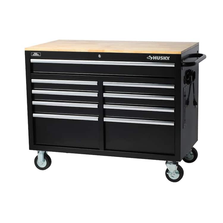 Husky 46 in. W x 24.5 in. D Standard Duty 9-Drawer Mobile Workbench Cabinet with Solid Wood Top in Gloss Black