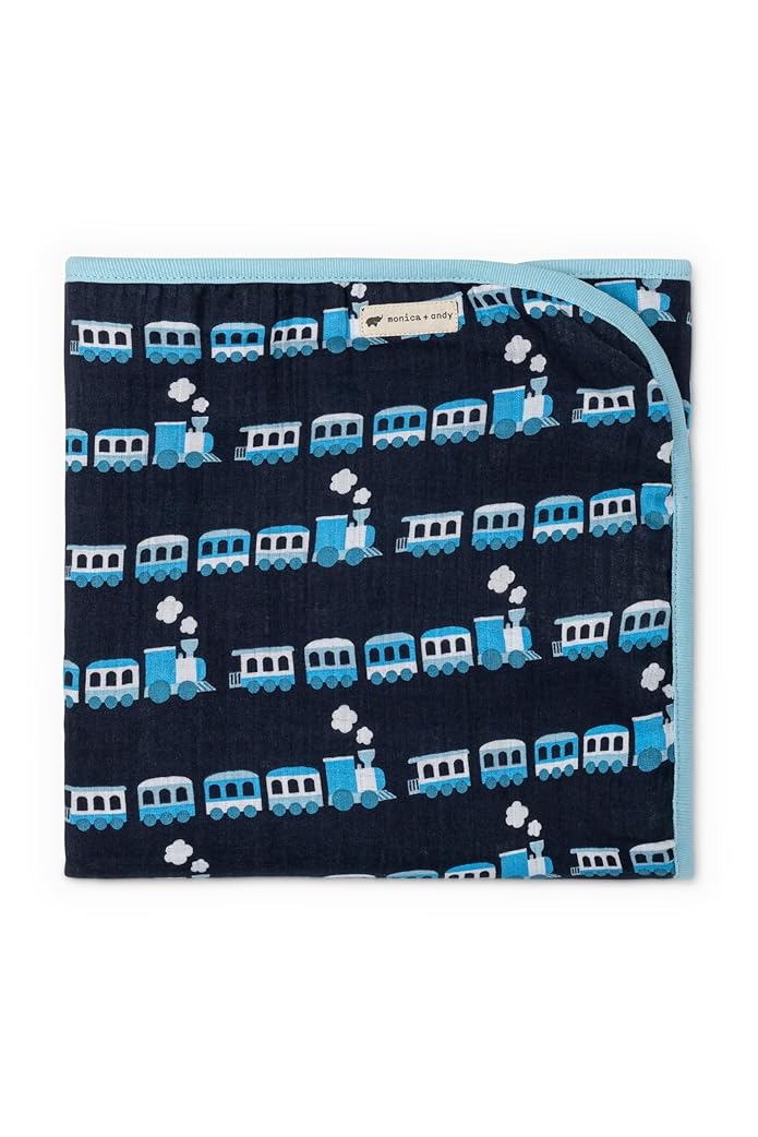 monica + andy Baby Organic Always Blanket, Blue Trains, One Size