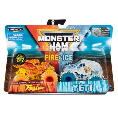 Monster Jam Fire & Ice Phoenix Vs. Yeti Monster Truck Die Cast Vehicles 1:64 Scale, 2 Pack Vehicle Playset