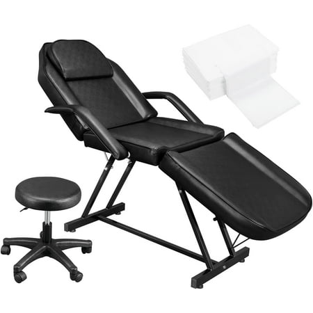OmySalon Massage Salon Tattoo Chair Esthetician Bed Facial Table with Hydraulic Stool & 25 Pcs Non-Woven Disposable Sheets, Black
