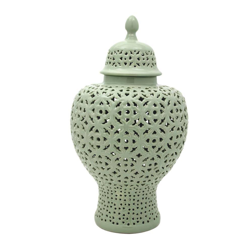 Oriental Furniture 25 in. Carved Temple Jar - Celadon