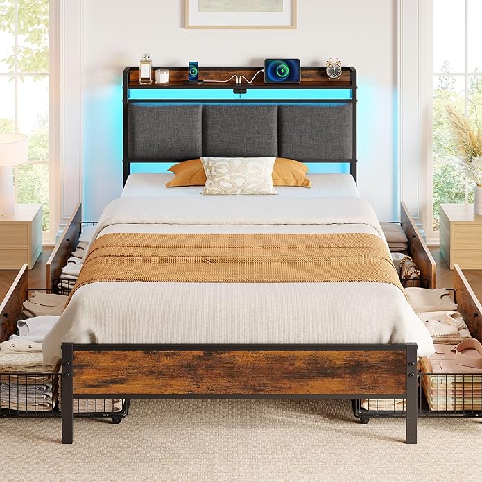 Rolanstar Bed Frame Twin Size with Charging Station and LED Lights, Upholstered Storage Headboard with Drawers, Heavy Duty Metal Slats, No Box Spring Needed, Easy Assembly, Rustic Brown