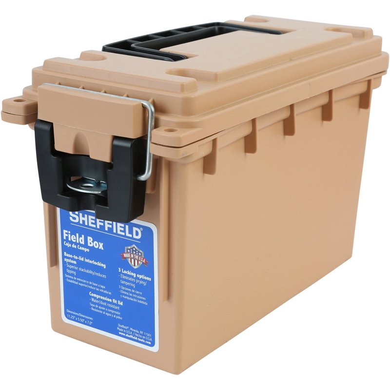 Sheffield 12627 Ammo Storage Box, Stackable .30 Cal Field Boxes, Water and Dust Resistant, Lockable Storage Box with Handle, Secures Hunting Gear, Supplies, and Bullets, Made in USA, Tan, 1-Pack