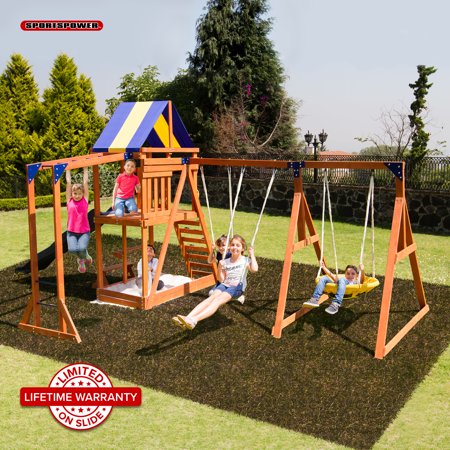 Sportspower Grand Mesa Wooden Swing Set with Saucer Swing & 8' Double Wall Slide with Lifetime Warranty
