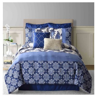 Paisley Faux Linen Comforter Set (Queen) 8-Piece - Navy