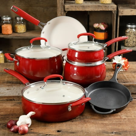 The Pioneer Woman Classic Belly 10 Piece Ceramic Non-stick and Cast Iron Cookware Set, Red