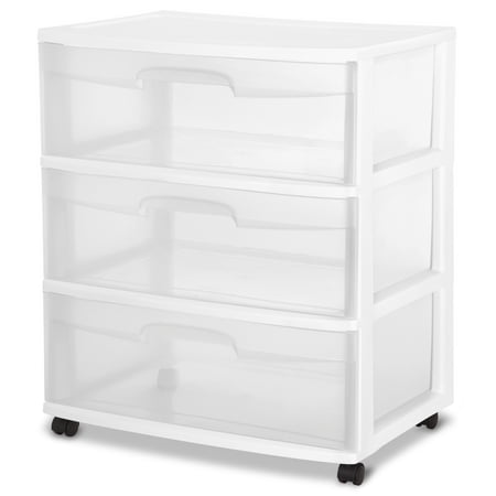 Sterilite 3 Drawer Wide Cart, Clear Plastic Storage Drawers, Wheels Included, White